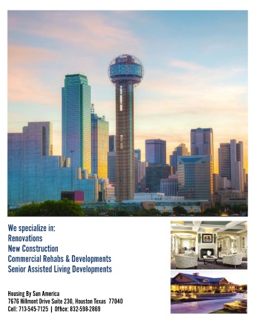 We specialize in: Renovations New Construction Commercial Rehabs & Developments Senior Assisted Living Developments Housing By Sun America 7676 Hillmont Drive Suite 230, Houston Texas 77040 Cell: 713-545-7125 | Office: 832-598-2869