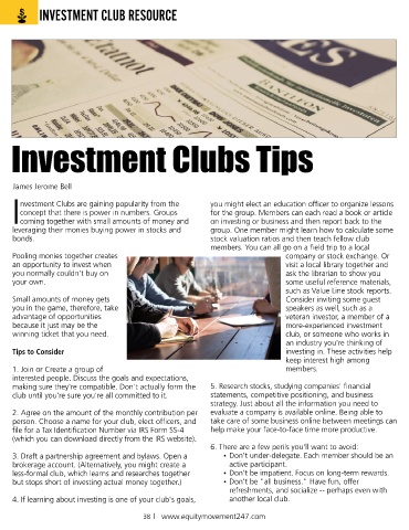 nvestment Clubs are gaining popularity from the you might elect an education officer to organize lessons